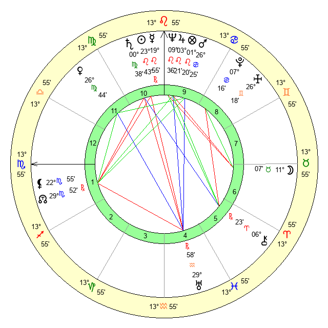 | Mercury | 19 Leo 55 | 6 Leo 39 | 11 Sagittarius 28 |