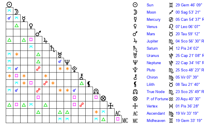 Mars | 20 Taurus 59 | 2 Virgo 16 | 12 Gemini 54 |