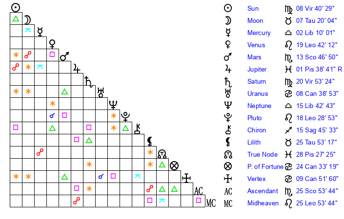 | Venus | 19 Leo 42 | 8 Leo 24 | 23 Scorpio 12 |