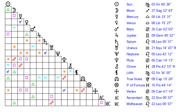| Moon | 27 Sagittarius 32 | 25 Libra 50 | 12 Sagittarius 38 |