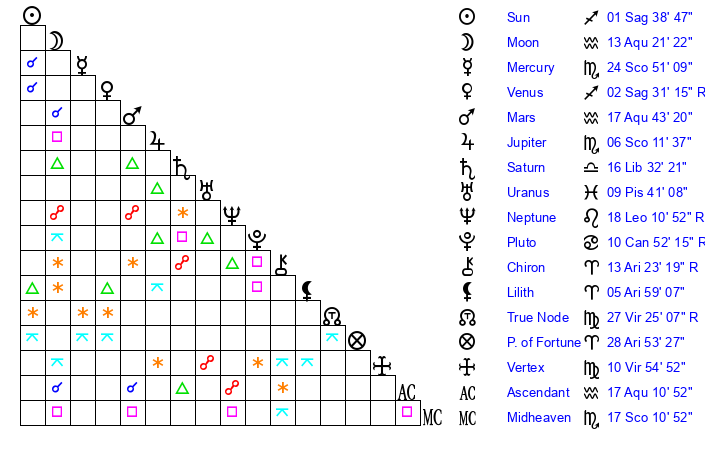 | Mars | 17 Aquarius 44 | 14 Sagittarius 39 | 2 Taurus 36 |