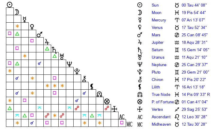 | Venus | 17 Taurus 53 | 26 Pisces 2 | 29 Virgo 56 |