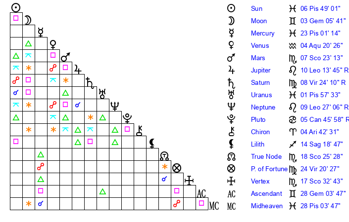 | Sun | 6 Pisces 48 | 8 Pisces 21 | 19 Gemini 28 |