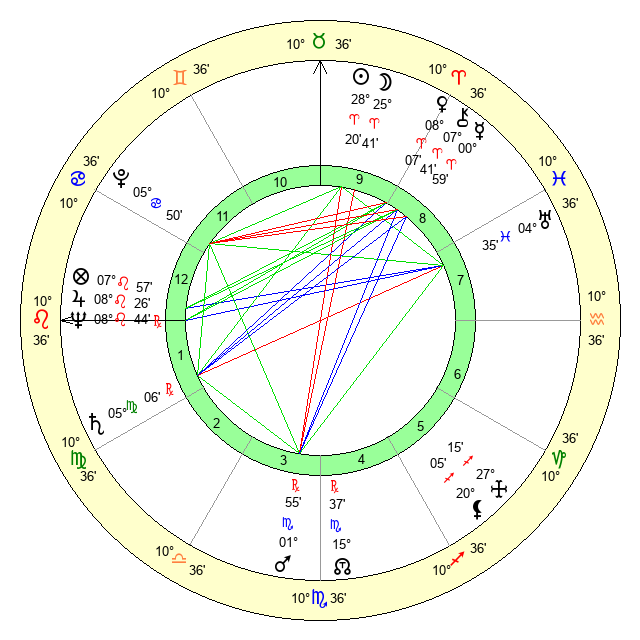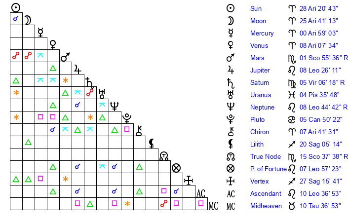 | Sun | 28 Aries 20 | 28 Aries 54 | 9 Leo 6 |