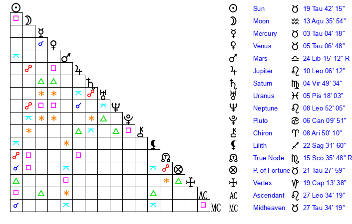 | Mercury | 3 Taurus 4 | 0 Taurus 20 | 14 Leo 59 |