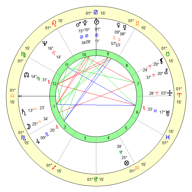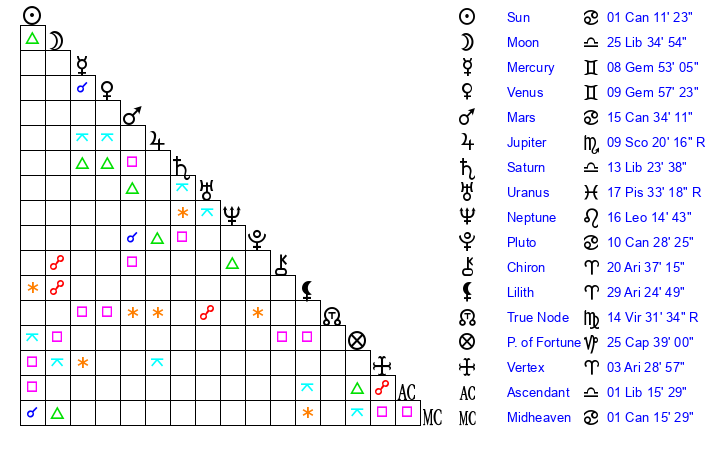 | Moon | 25 Libra 39 | 8 Gemini 40 | 14 Cancer 53 |