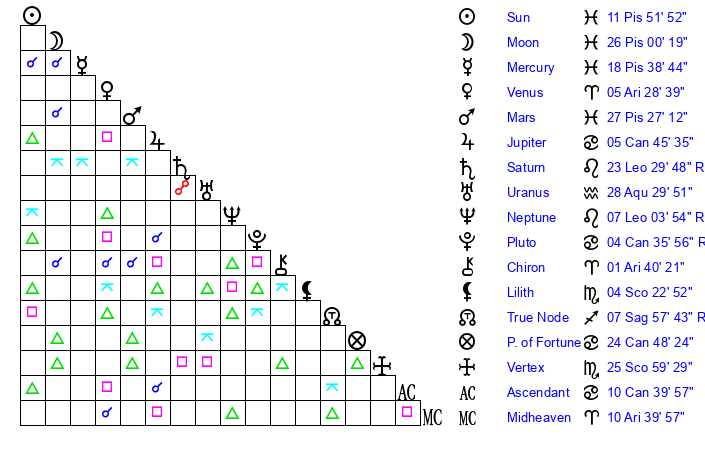 | Sun | 11 Pisces 52 | 13 Pisces 9 | 25 Gemini 14 |
