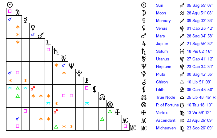 Jupiter | 21 Sagittarius 51 | 17 Gemini 29 | 28 Sagittarius 26 |