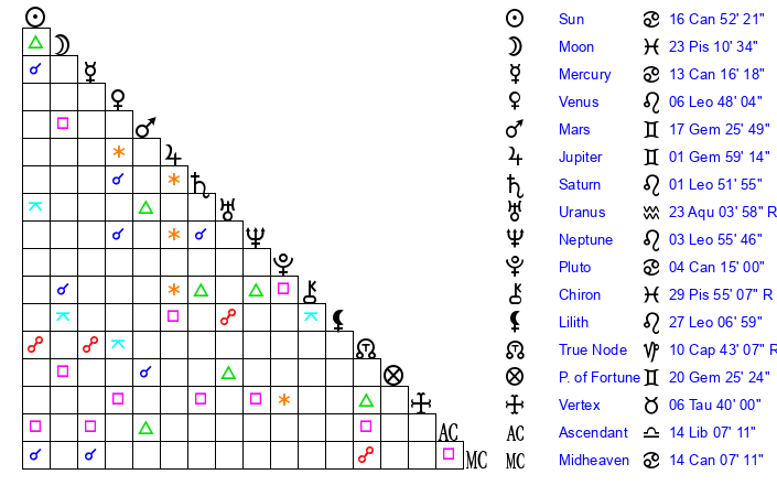 | Pluto | 4 Cancer 15 | 2 Aquarius 56 | 5 Cancer 27 |