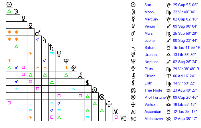 | Sun | 25 Capricorn 55 | 26 Capricorn 49 | 20 Pisces 28 |