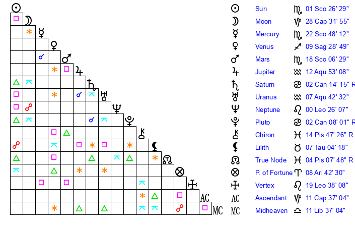 | Neptune | 0 Leo 26 | 29 Pisces 54 | 28 Cancer 24 |