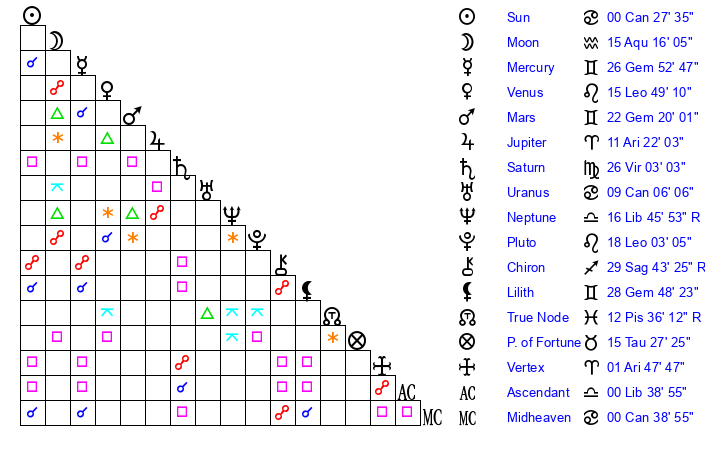 | Sun | 0 Cancer 27 | 1 Cancer 31 | 11 Virgo 21 |
