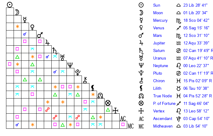 | Sun | 23 Libra 28 | 24 Libra 34 | 15 Aquarius 49 |