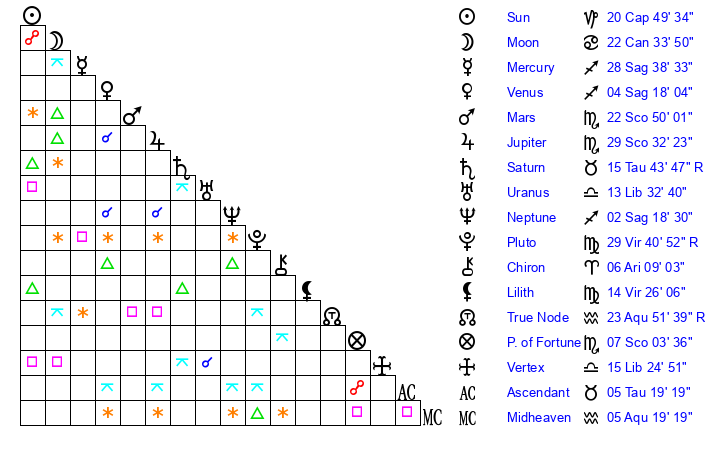 | Saturn | 15 Taurus 59 | 26 Pisces 47 | 18 Taurus 6 |