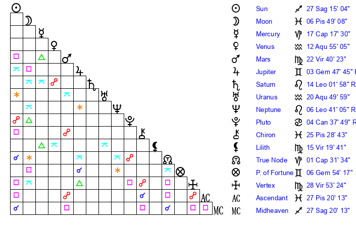 | Moon | 6 Pisces 43 | 24 Sagittarius 4 | 13 Aquarius 32 |