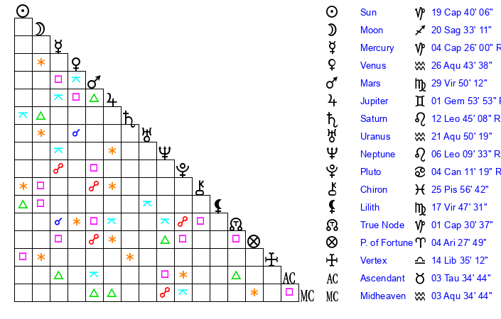 | Moon | 20 Sagittarius 33 | 20 Libra 58 | 4 Sagittarius 29 |