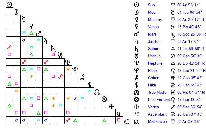 | Moon | 1 Taurus 5 | 12 Pisces 58 | 24 Sagittarius 33 |