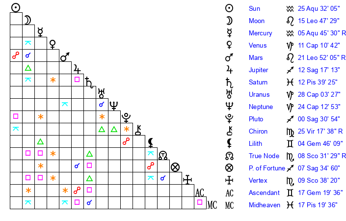 Moon | 15 Leo 46 | 20 Virgo 25 | 21 Virgo 3 |