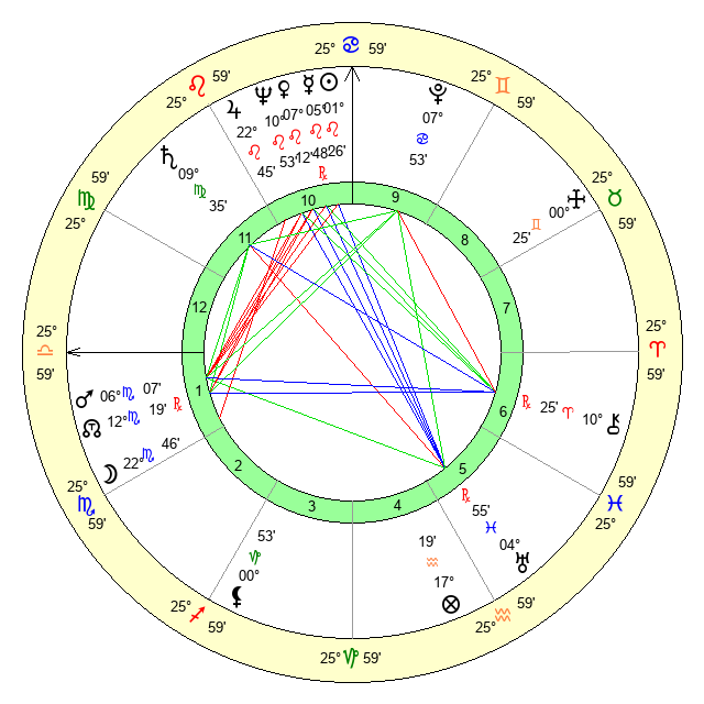| Moon | 22 Scorpio 54 | 0 Leo 46 | 26 Virgo 55 |