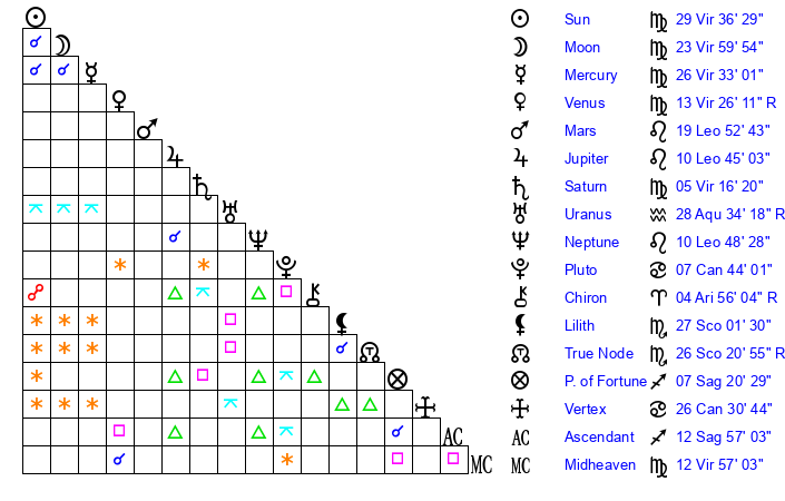| Saturn | 5 Virgo 55 | 28 Pisces 12 | 12 Virgo 12 |