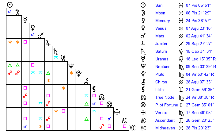 | Sun | 7 Pisces 6 | 8 Pisces 21 | 11 Taurus 18 |