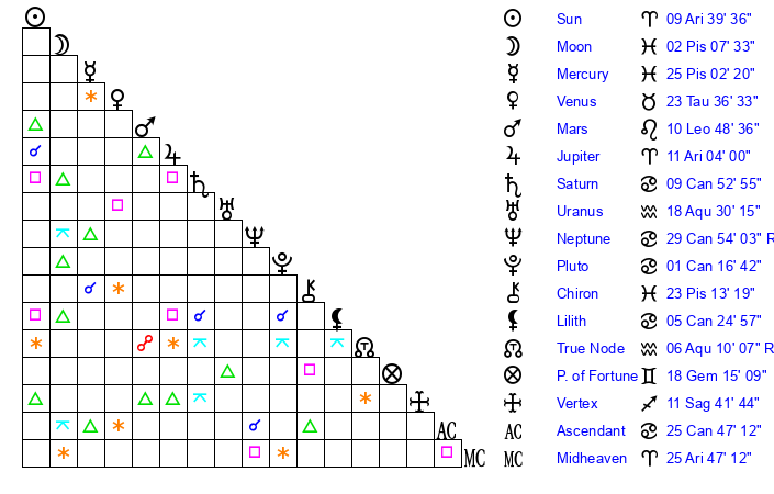 | Moon | 2 Pisces 9 | 27 Aries 55 | 0 Pisces 1 |