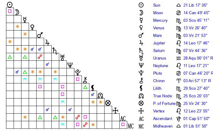 | Saturn | 8 Virgo 24 | 26 Pisces 36 | 11 Virgo 13 |