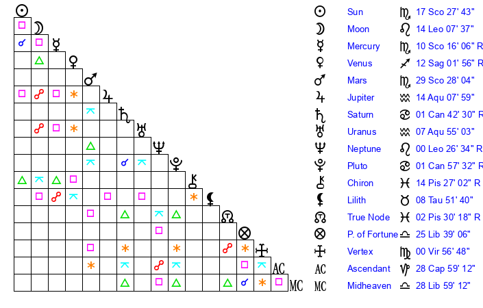 | Mercury | 10 Scorpio 16 | 6 Sagittarius 47 | 24 Aquarius 40 |