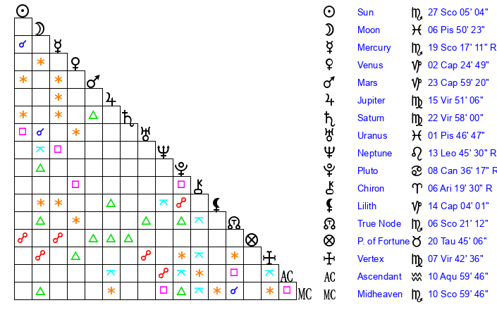 | Sun | 27 Scorpio 5 | 27 Scorpio 37 | 13 Pisces 35 |