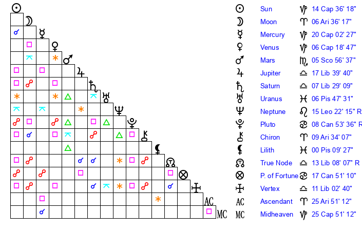 | Sun | 14 Capricorn 36 | 15 Capricorn 22 | 28 Aries 51 |