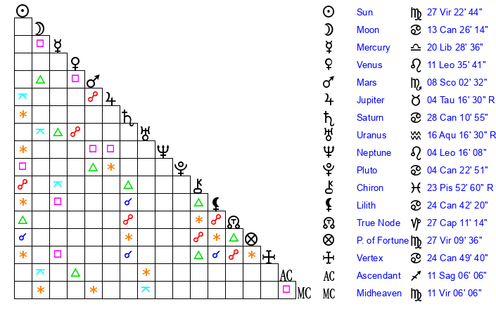 | Moon | 13 Cancer 32 | 14 Virgo 58 | 10 Cancer 7 |