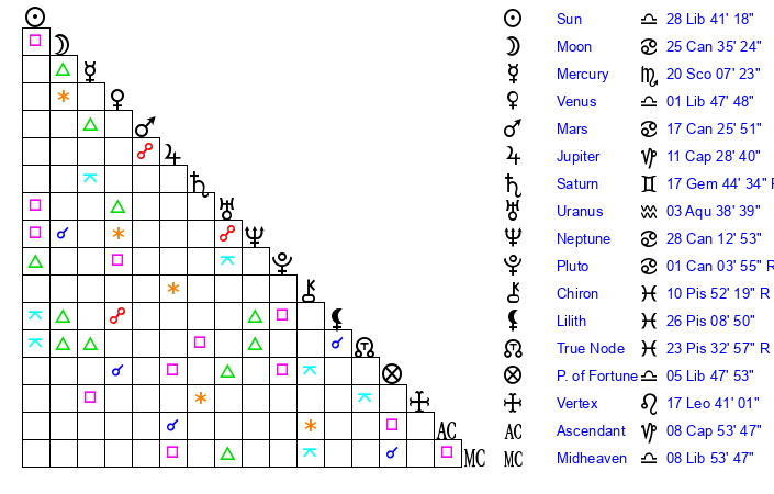 | Neptune | 28 Cancer 13 | 29 Pisces 59 | 26 Cancer 10 |