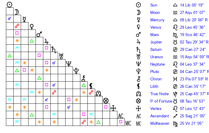 | Sun | 14 Libra 5 | 14 Libra 41 | 4 Aquarius 10 |