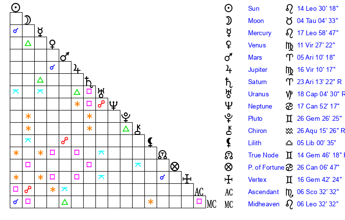 | Sun | 14 Leo 31 | 15 Leo 26 | 8 Sagittarius 53 |