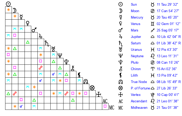 | Saturn | 2 Libra 22 | 27 Pisces 56 | 5 Libra 19 |