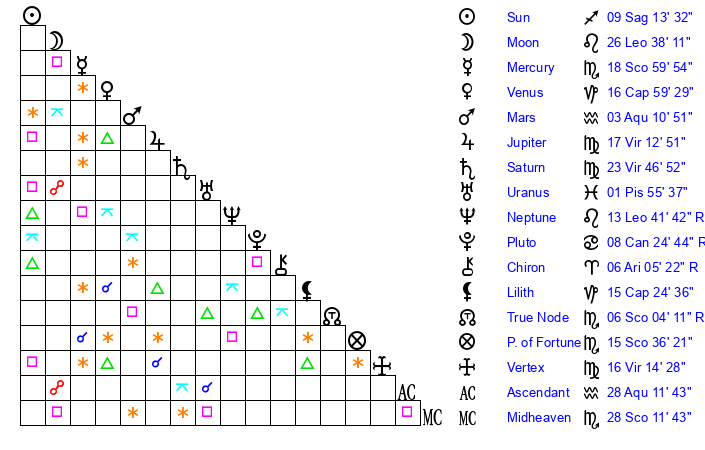 | Venus | 16 Capricorn 59 | 1 Sagittarius 5 | 5 Taurus 50 |