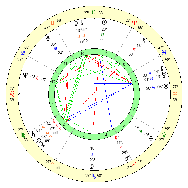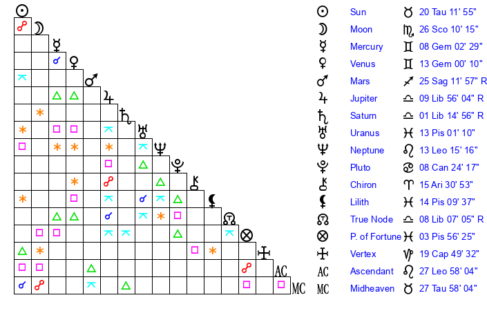 | Moon | 26 Scorpio 12 | 10 Scorpio 19 | 26 Leo 35 |