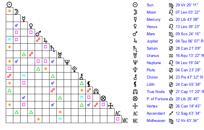 | Venus | 13 Leo 39 | 3 Virgo 53 | 22 Sagittarius 51 |