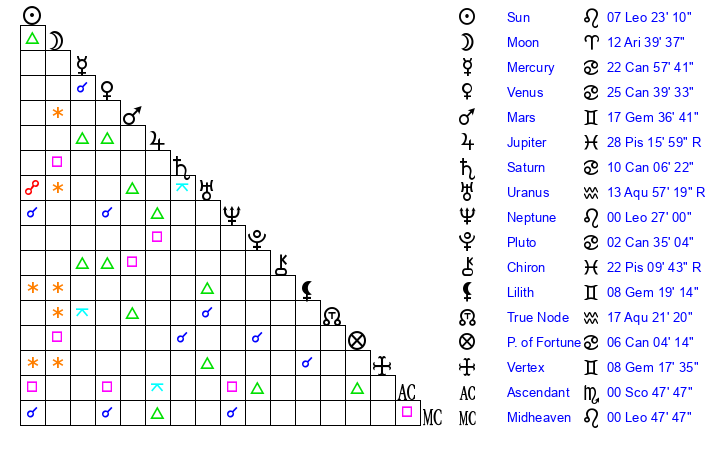 | Moon | 12 Aries 45 | 29 Libra 51 | 21 Aries 28 |
