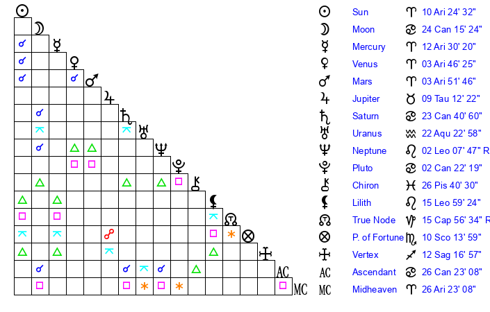 | Sun | 10 Aries 24 | 11 Aries 14 | 24 Cancer 30 |