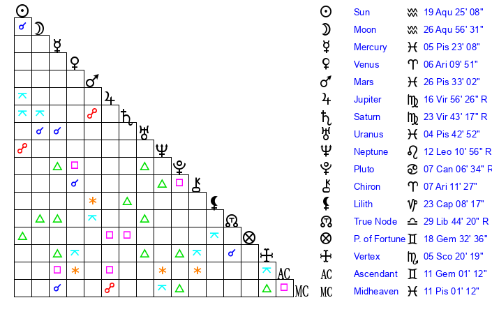 | Sun | 19 Aquarius 25 | 20 Aquarius 11 | 1 Gemini 59 |
