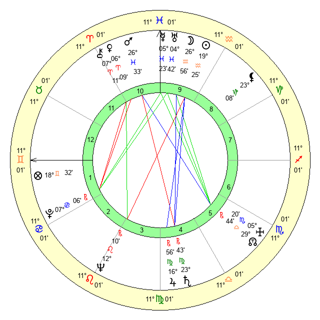 | Jupiter | 16 Virgo 39 | 11 Gemini 18 | 9 Virgo 9 |