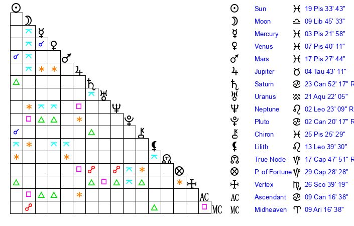 | Sun | 19 Pisces 33 | 20 Pisces 22 | 4 Cancer 28 |