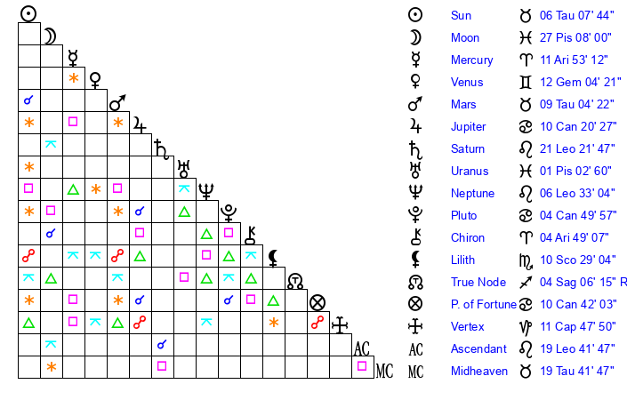| Moon | 27 Pisces 7 | 2 Taurus 26 | 14 Aquarius 19 |