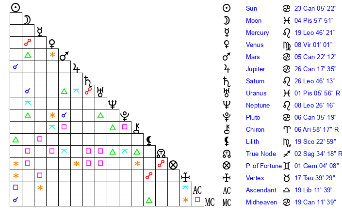 | Pluto | 6 Cancer 35 | 2 Aquarius 46 | 7 Cancer 40 |