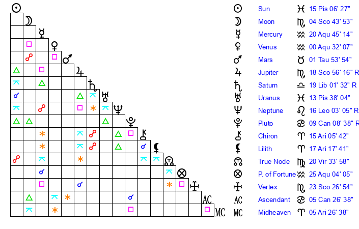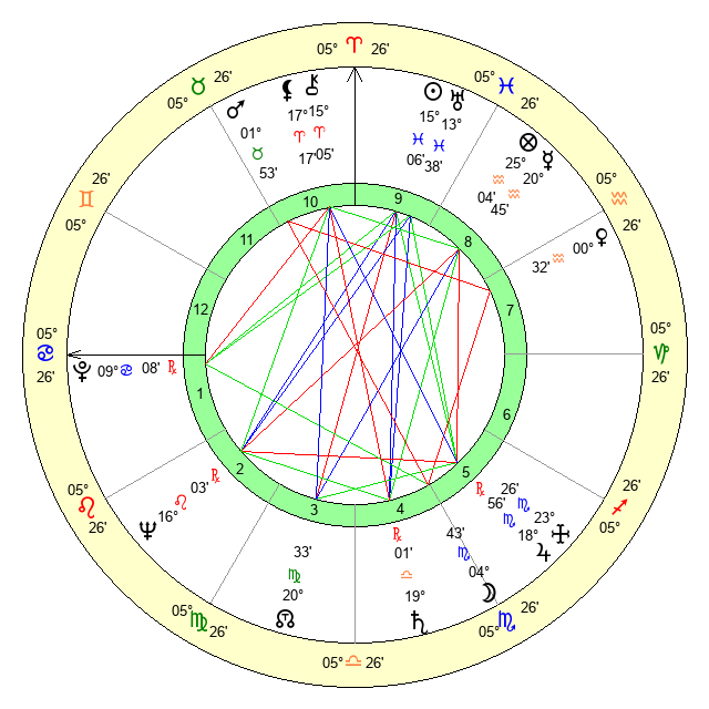| Moon | 4 Scorpio 37 | 16 Gemini 40 | 20 Cancer 17 |