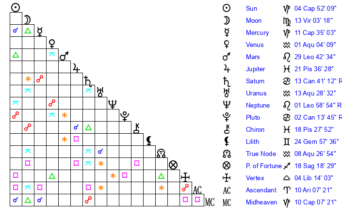 | Moon | 13 Virgo 0 | 5 Aries 7 | 23 Virgo 29 |