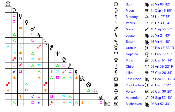 | Sun | 28 Virgo 8 | 28 Virgo 43 | 13 Capricorn 34 |
