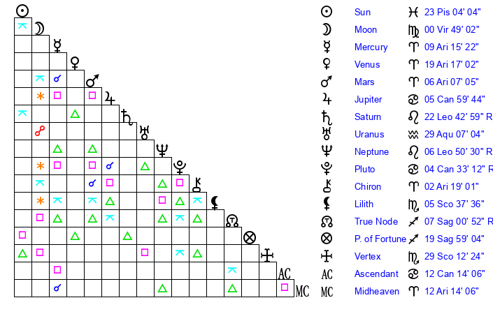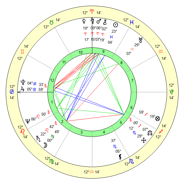 | Mars | 6 Aries 6 | 18 Cancer 59 | 23 Gemini 12 |