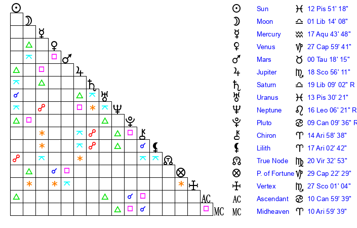 | Saturn | 19 Libra 50 | 21 Pisces 2 | 14 Libra 1 |